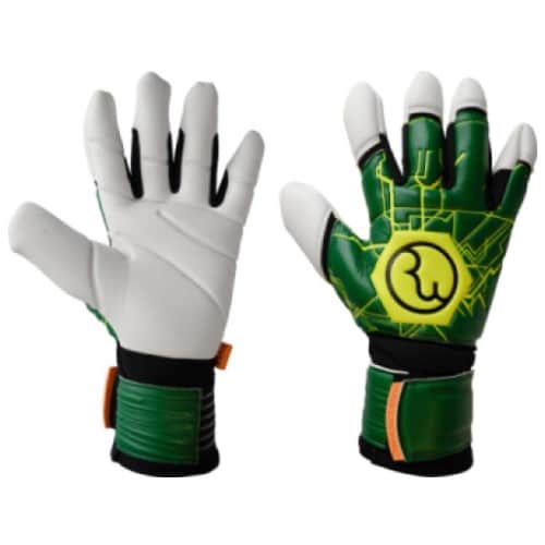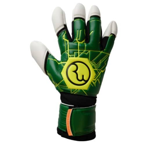- De keepershandschoen heeft een hybride palm waarbij de overlap op de vingertoppen zorgen voor een extra contact met de bal.